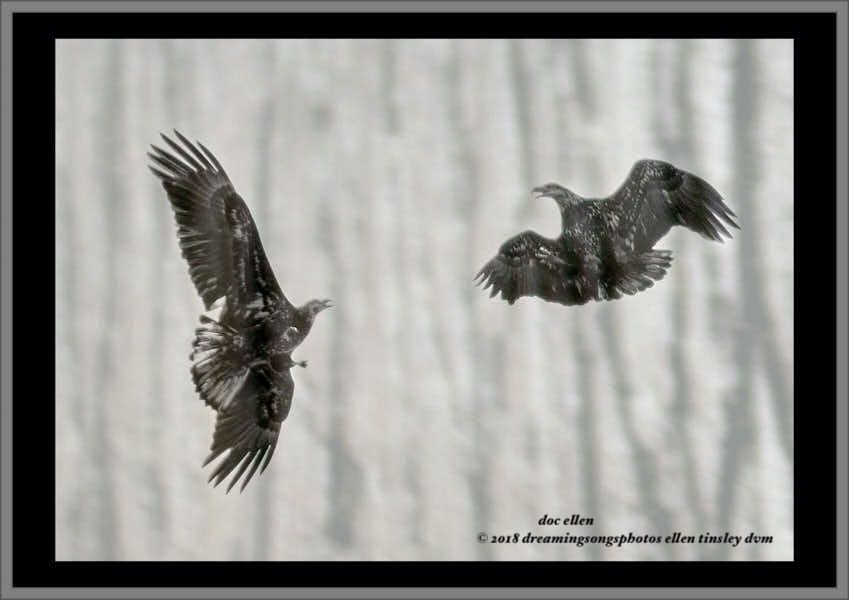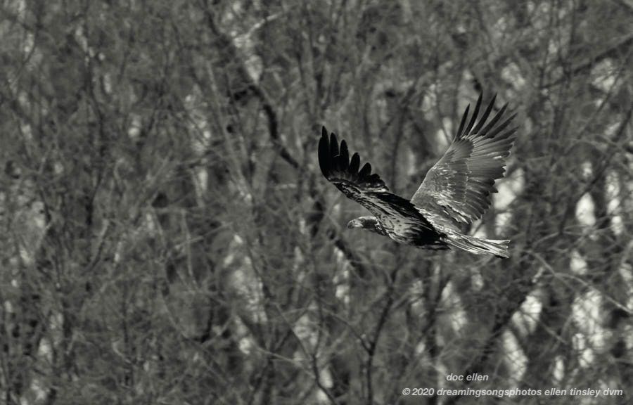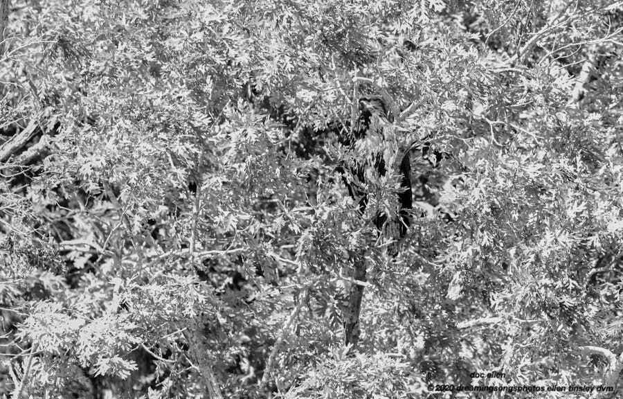Jordan Lake, Haw River: Doc Ellen’s Palette, where the 12-year-old child in me looks at the world a wee bit differently. Bald Eagle Fledgling in Black and White. And, oh so well camouflaged – look for the very black beak!