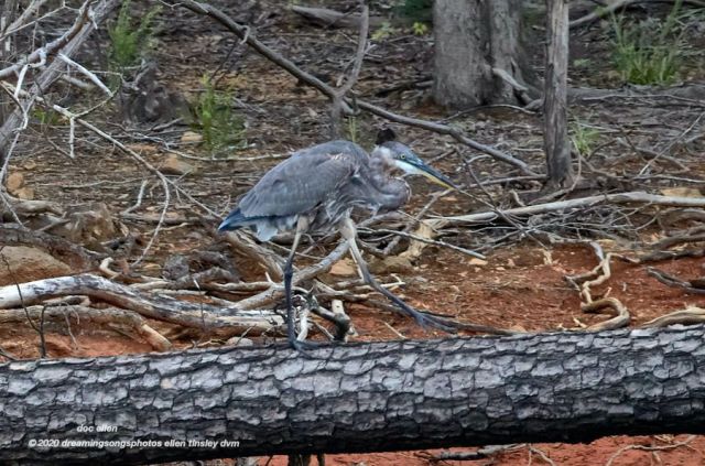 Jordan Lake, Haw River: While out with Captain Doug on the lake yesterday, we spotted this fledgling great blue heron. The youngster was hatched this spring, but, his young age doesn’t keep him from knowing with absolute certainty that all of the shoreline belongs to him. He walked the fallen tree to the end and surveyed his world.