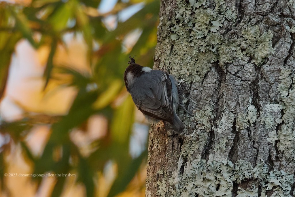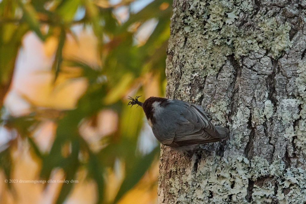 Jordan Lake. The 28°F weather this morning caused the normally very sleek little brown-headed nuthatch to get all puffed up as his feathers trapped heat against his body. That did not slow down his hunting. He’s got an insect of some sort for his breakfast.