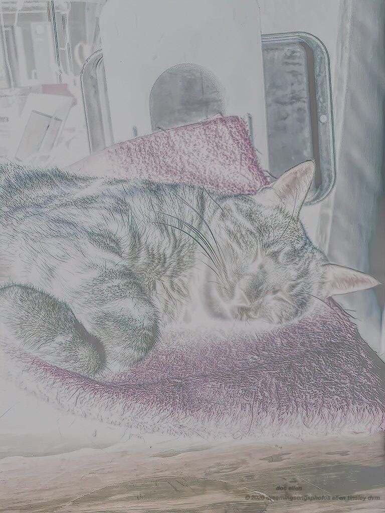 Coming sleep drifts translucent across brilliant colors and softens scene as Grayced shows us how to sleep. Peacefully. Sleep well, Doc Ellen.