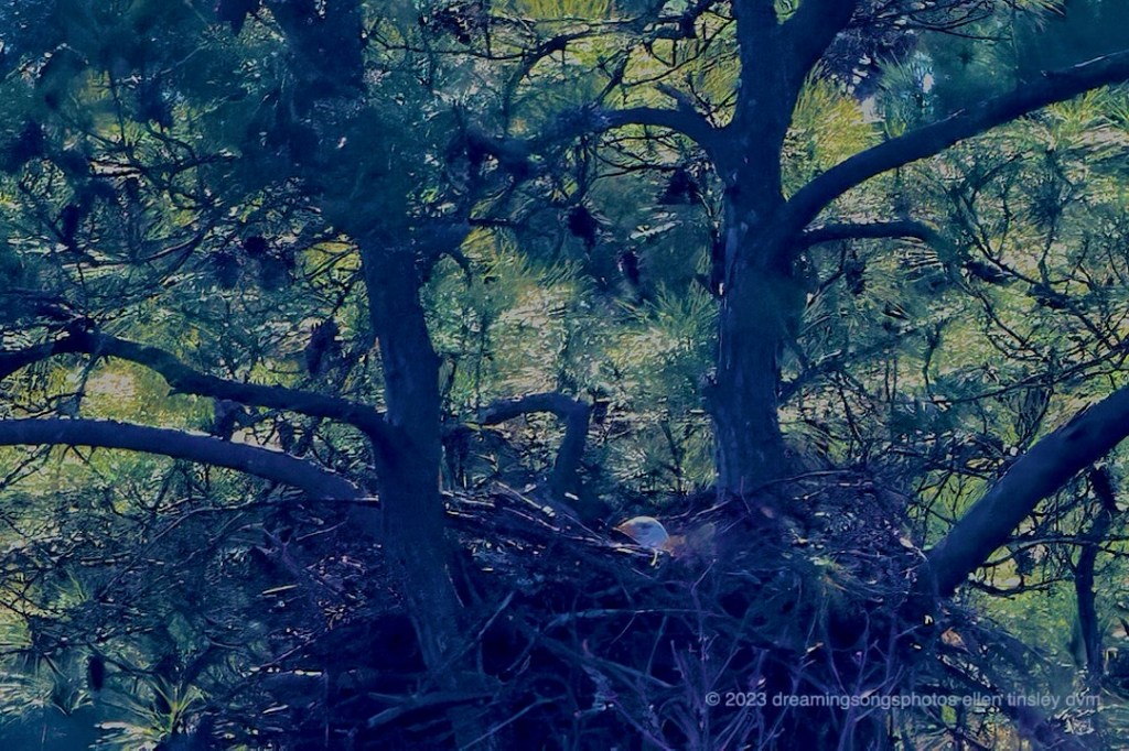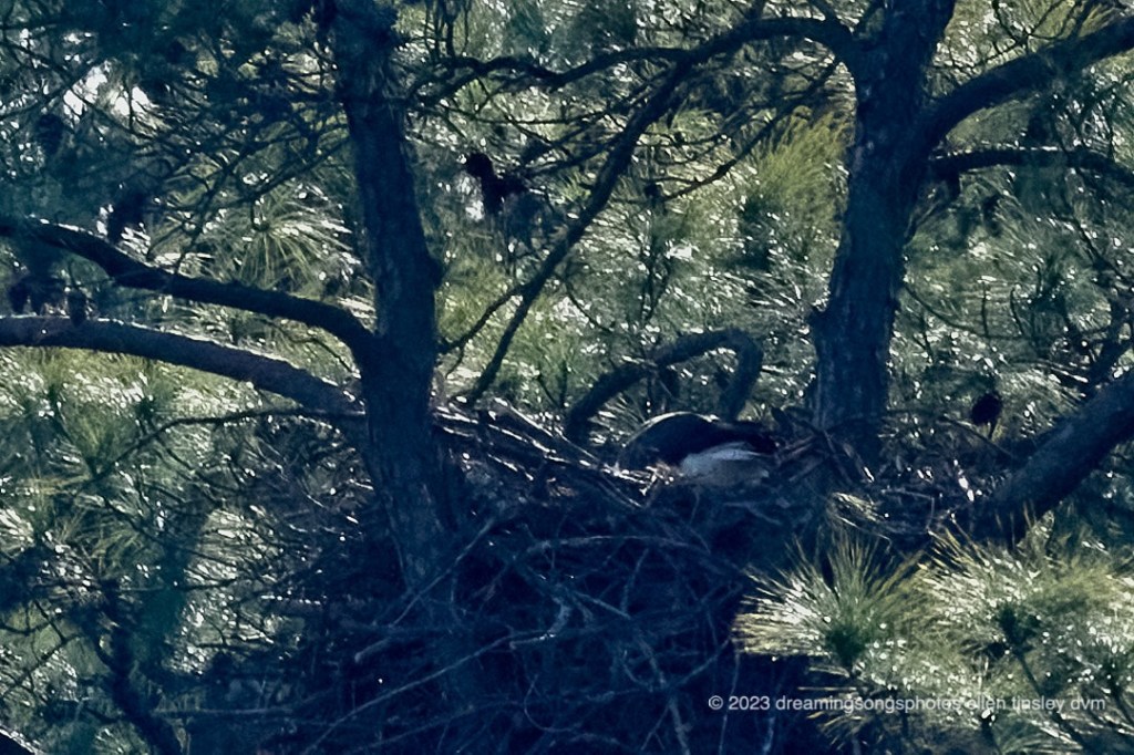 First Nest had a visitor … one of last year’s triplets! I matched the plumage markings to the fledgling photos of last spring. The visitor was the smallest of the triplets. I have seen three times at the lake when a yearling showed up and visited its home nest and was tolerated. This is the first time I’ve seen one get closer than 50 feet to the nest! My goodness!!!
