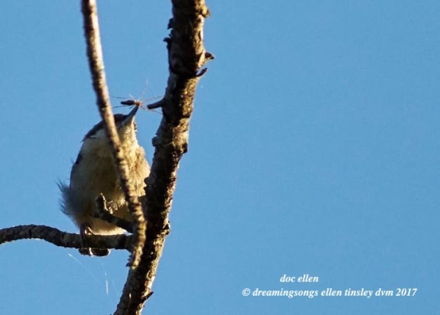 The tiny brown-headed nuthatch has snagged one of her favorite sources of protein: