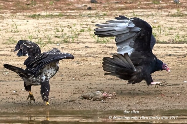 Petruchio the dad was on the nest brooding the chick(s) when an immature turkey vulture tried to invade the nest (see its wing tip at the very top of the first photo of the slide show; the nest and Petruchio are at the very bottom right). Mom Kate was almost out of sight out near the main lake when she heard Petruchio’s calls for help. Kate quickly dashed across the lake and cove and there began a terrific chase across the sky. Kate routed the vulture and soon chased it out of my sight and down behind the trees. Kate returned some minutes later. All the eagles were safe. A slide show of the chase can be seen at https://youtu.be/QpOE-eX2gjU