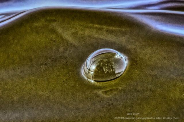 Doc Ellen’s Palette (I don’t think I will ever entirely grow up…) I was chasing water bubbles, made in the waves by the passing boats, and simply seeing if I could stop the bubbles’ sliding motion. What I didn’t realize was just how much reflection of the shoreline I was also recording. In the bubble: that is the sun to the left, because I am looking south, and the shoreline I am sitting on and its tall trees cross the diameter of the bubble. There are even a few clouds to the right/north in the reflection.