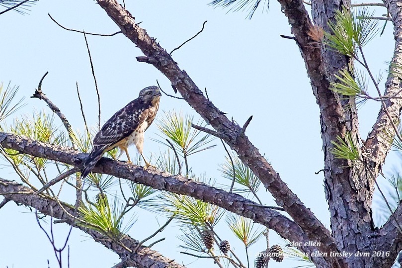 Uh, oh. As I watched a hawk zip over my head this morning, I found myself thinking it sure looked liked a “T” in flight and that could make it an Accipiter (Cooper’s hawk or sharp-shinned hawk). But then I glanced at the wings as it zipped past and went to attack a crow that was perched in a tree, and said no, leading wing edge said it had to be a red-shouldered hawk. Then my brain said wait a minute, red-shouldered hawks don’t usually go after something like a crow. And I dismissed all those thoughts because two juvenile eagles went across the sky chasing each other. Then I got home and started looking at this morning’s photos. I should always go with my first thought. It was an Accipiter. Drat that I didn’t notice that LONG tail and its band configuration. The hawk is a sharp-shinned hawk.