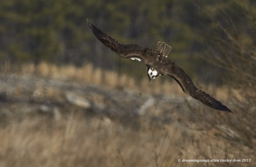 The eagle jumped Ace the osprey as the smaller bird lifted his fish from the river. For about 90 seconds the eagle pursued Ace, trying to get the osprey to drop his fish. An eagle will ram an osprey then catch the fish midair if the osprey drops it. Ace finally flipped up on one wing and dove between two closely growing trees, his fish still in his talons. The eagle sulked off down river.