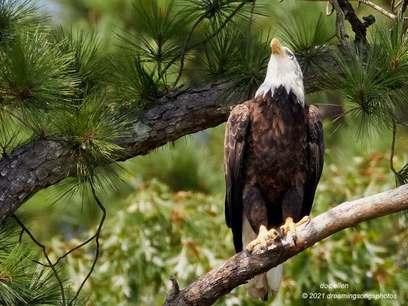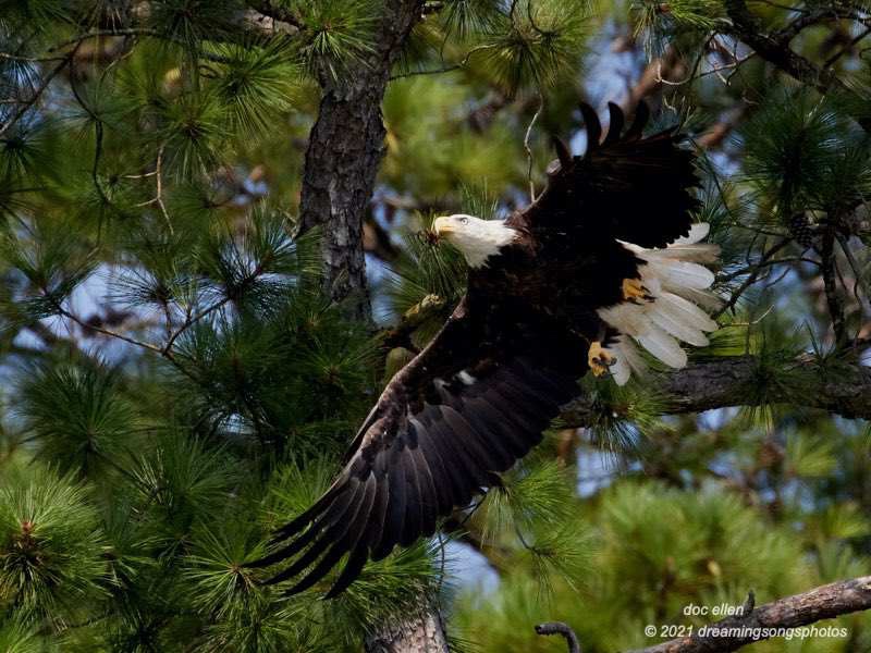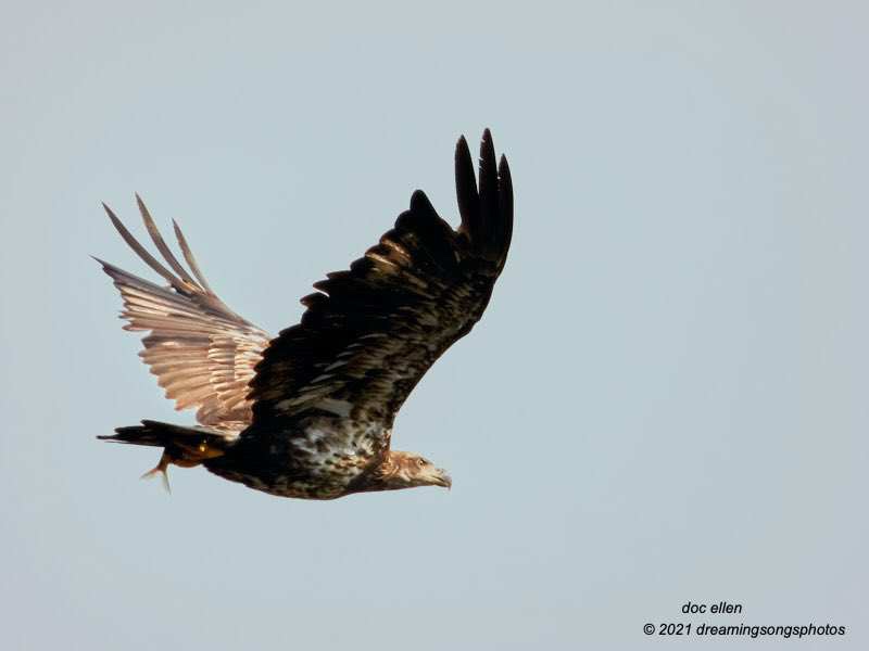 Jordan Lake, Monday, August 2, 2021. Lake level was at 216.09 ft. I was talking with one of the Rangers this morning, when this three-year-old bald eagle showed up. She glanced over at us. Didn’t see anything about us that seemed to worry her and so she turned her head away and kept right on flying. She is carrying what appears to be a very small catfish for her breakfast.