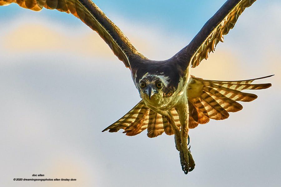 Mom osprey was set to grab the fish and bolt for her nest. The fledgling great blue heron, being very inexperienced, tried to get the fish too. A mature great blue heron would not have made the attempt. Mom osprey would not have challenged an adult great blue heron. The fish won the face-off. This time.