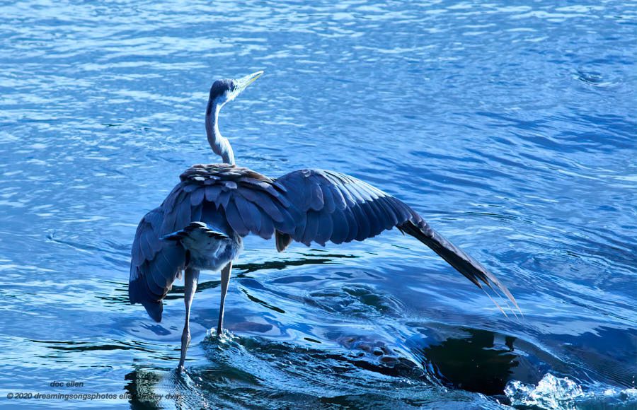 Jordan Lake, Haw River: Great blue herons are actually gray, until, just until you see them, literally in the right light. Such as finding this fledgling great blue heron this morning in the shadows of the banks of the riprap as the sun had fully cleared the horizon. Azure blue air, water and heron!