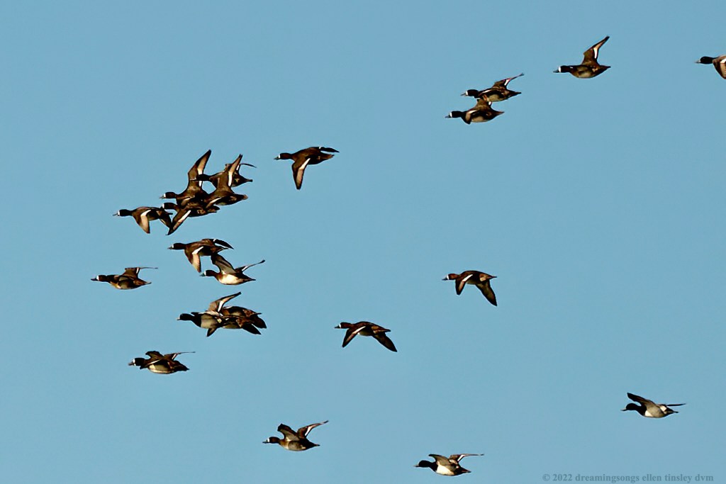OK! Dr. O’Shea at Ask a Naturalist at the NC Museum of Natural Sciences sent me this reply to my query if the flock of birds I had posted were Greater or Lesser Scaups: “Those are Lesser Scaup. Greaters do occur inland on the larger lakes, but it would be unusual to see so many away from the coast. Head shape can be a useful field mark, but not on flying birds. Fortunately these photos show the wing stripe very well. On a Greater Scaup, this stripe extends farther out into the primaries.”