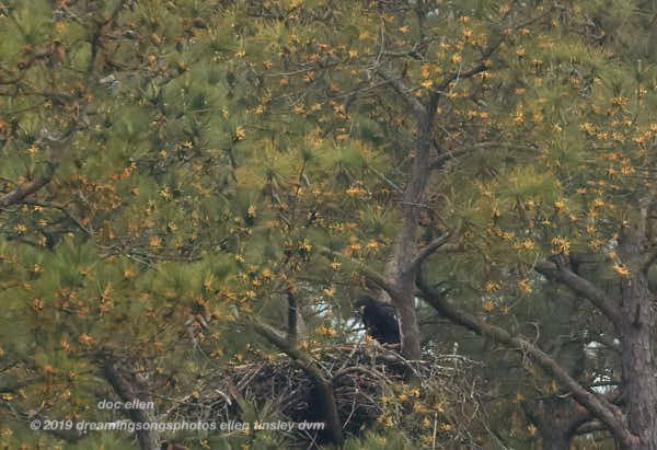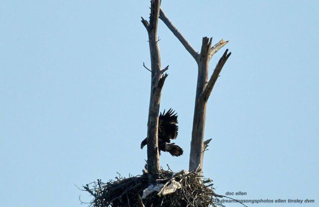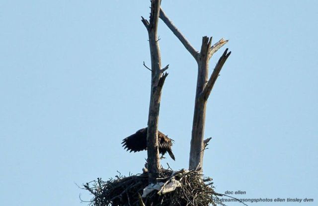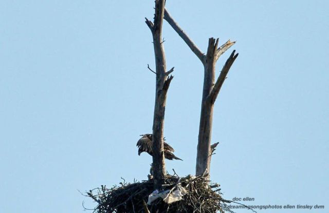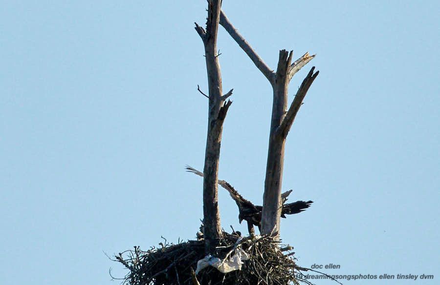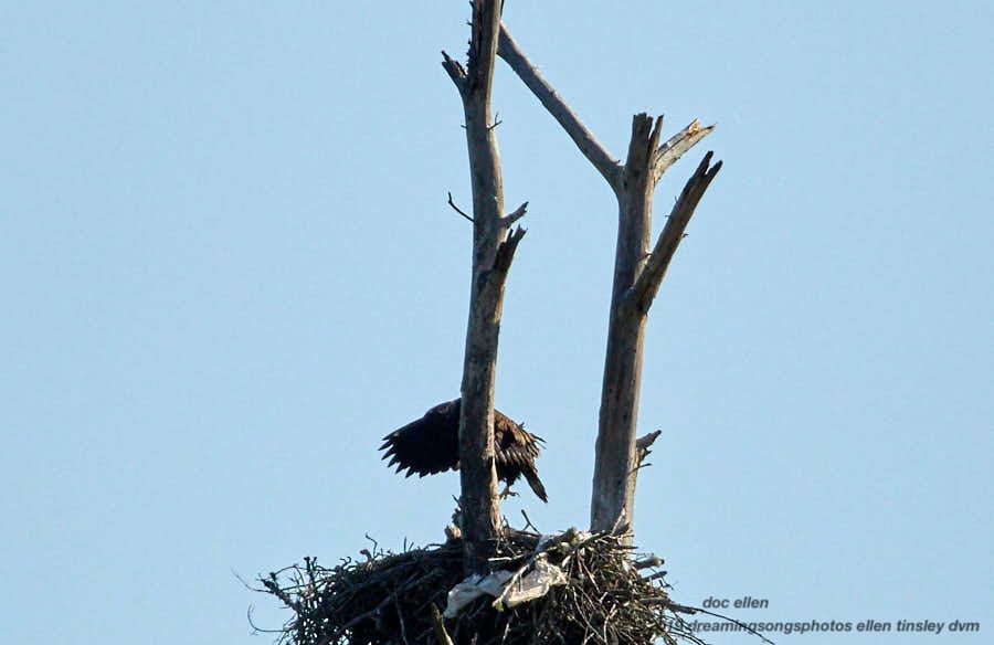 Jordan Lake. First Nest. “Oh, one of the chicks branched,” exclaimed Captain Doug as we came into the cove and could see the nest. The chick that is upper right in the photo is the one who has branched. Bald eagle chicks practice branching as the last step before they actually fledge. They hop, flutter, fly up to a branch above the nest. That way the chick gets some practice in using its muscles & wings while it still has the nest below as a safety net. This is the last step before the chick will fly away from the nest for the first time. Branch, chicks, branch!