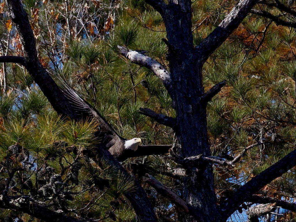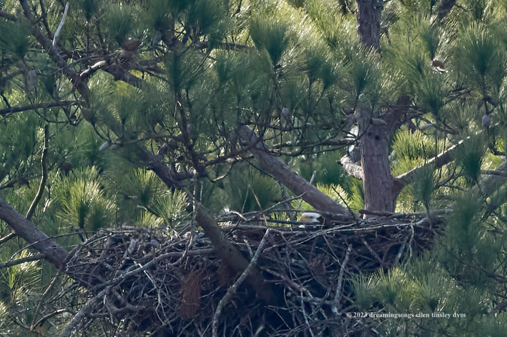 Jordan Lake. While Captain Doug and I were out checking various nests we managed to watch the mom bald eagle from Captain’s Nest do a spectacular launch. In the nest photo that is Dad incubating. As you can see he looks small in the nest because all nests are constructed to fit the girth of the much larger bald eagle hen.
