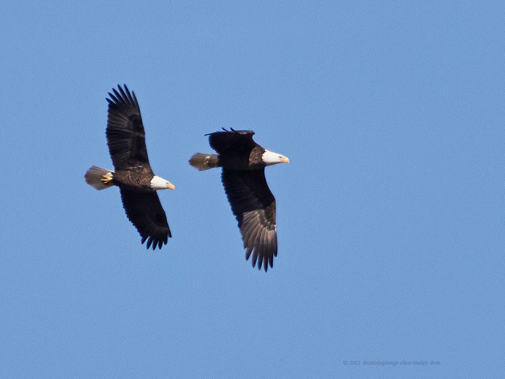 Jordan Lake: Captain Doug and I had just checked the nest and there wasn’t anybody at home. When all of a sudden high through the trees came Captain Dad. He was in a big hurry and he was headed upstairs, so to speak. As you can see he caught up with his lady. That’s Captain Mom in the lead in the photos of the pair in flight. They went up in the air, circling higher and higher and higher and finally got totally out of our sight. Eagles like doing that kind of flying! Especially together as a pair.