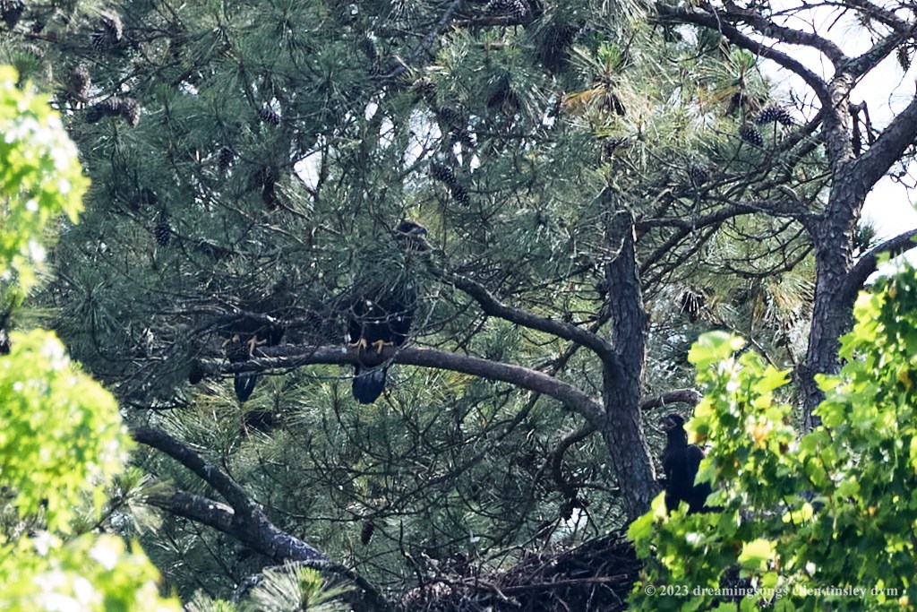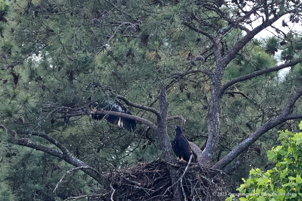 Jordan Lake. First Nest. Two of the three triplets have branched. When a bald eagle chick branches it jumps / hops / half flies to a branch above the nest. They use the nest as a safety net below them. This is the last practicing step before they fly! Look for the 2 sets of yellow feet on the branch above and to the left of the chick in the nest.