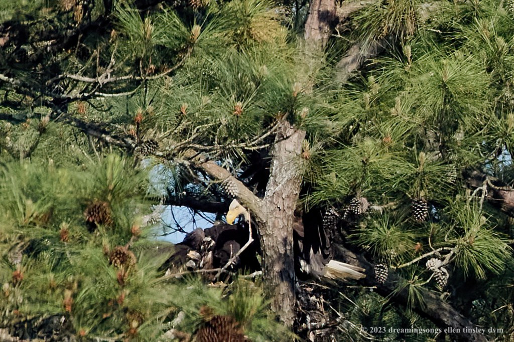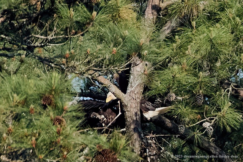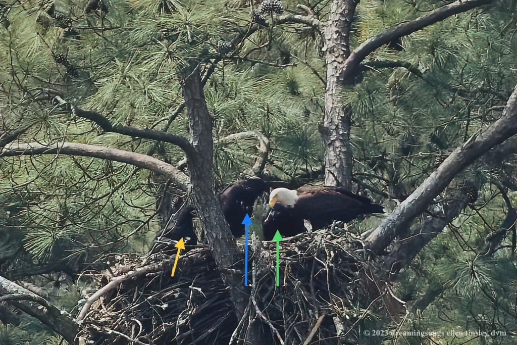 Jordan Lake. All three of the TRIPLETS are alive and doing well! Captain Doug and I managed to get out today to monitor our nests after the big rain, high lake levels and wind. Dad Bard is feeding his chicks. Second photo with arrows so that y’all can see where all three chicks were in the nest. I hope all of you are smiling as big as I am.