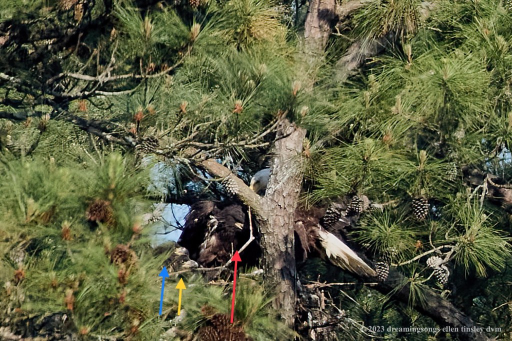 Jordan Lake. First Nest. Dad Bard landed in the nest with a small fish. All 3 chicks were watching his feet. They knew where the fish was. Then there was a shoving match to see who would end up with the fish. It was Big Chick that won the fish. All three chicks are doing well. Arrows in first photo point to the 3 chicks.