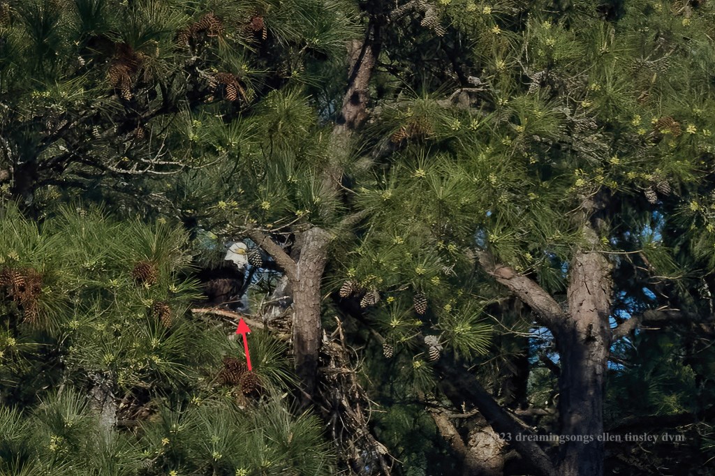 Jordan Lake. Oh, joy! I managed to photograph a chick in the nest with mom Kate. The arrow is pointing at the baby underneath her chest area (above arrow). You can see a silhouette of the head and beak as the chick is facing to the right. Too many shadows for me to have any idea yet of the age of this one.