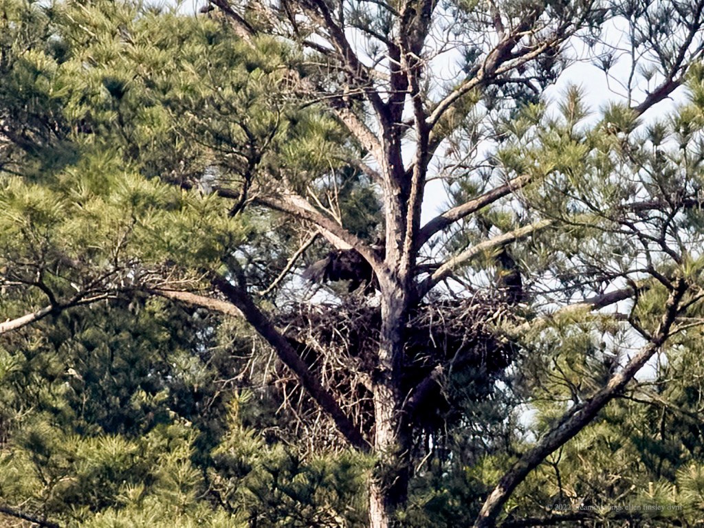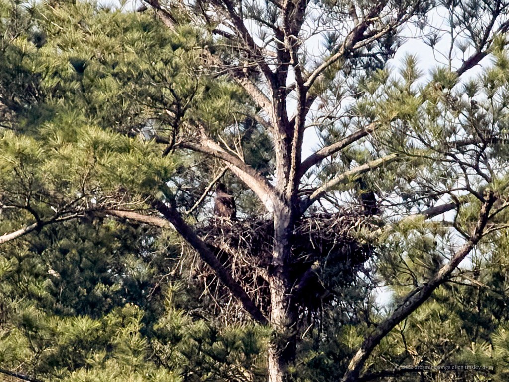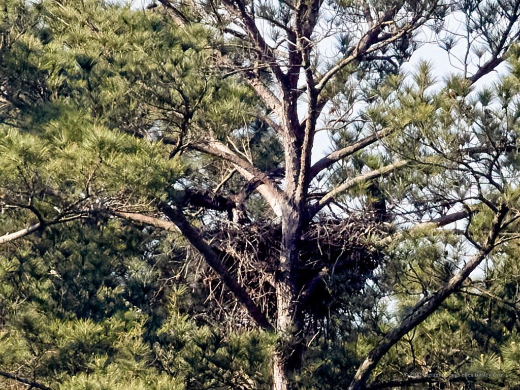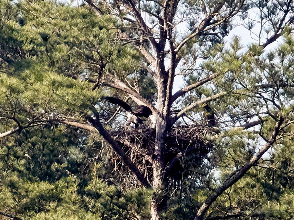 Jordan Lake. Oh my! A bald eagle CHICK! This is the first chick I have seen this season. The 4-5 week old chick is located at the Mystery Nest. For a long time we were not sure if this new nest was going to be occupied. To locate the chick: go to the right from mom eagle until you run into the big branch sticking out at you, then look for the black beak of the chick above the nest brim. I think there may be a second chick just to the right of that big branch.