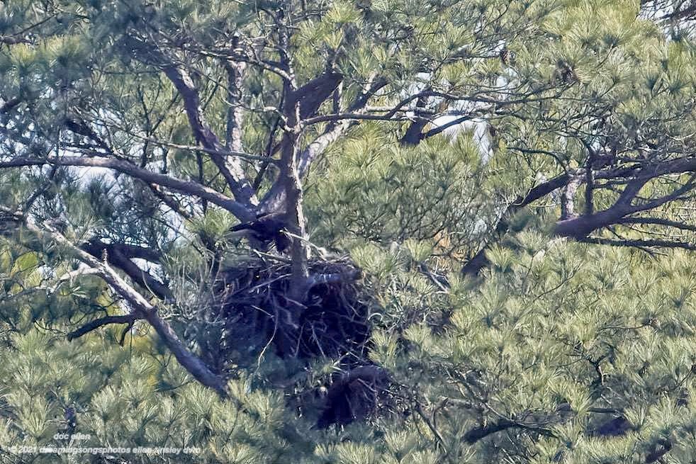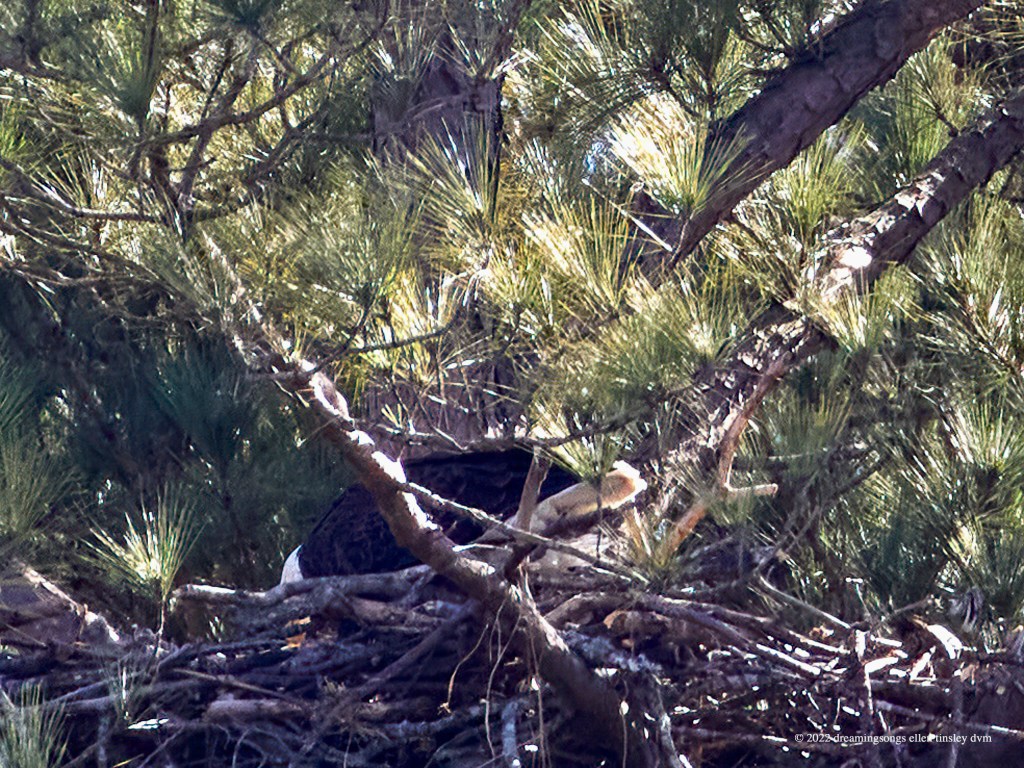 Jordan Lake: At least one egg has HATCHED! We don’t know yet if there is a second egg/chick. That is mom Loblolly reaching down towards the chick. She’s got a bite of fish in her beak. We can’t quite see the chick yet. The next two weeks are extremely critical to this chick because a chick must to be at least two weeks old before it can thermal regulate – in other words it can’t control its own body temperature until then and depends on the parent’s body heat for warmth. So on one hand I am very glad that it is warm today and that the chick won’t get chilled if the parent should be spooked from the nest. On the other hand, and I don’t blame them, there will be more people out at the park because the visitors want to be outdoors in the sunshine. I just pray that the visitors all respect these bald eagles and stay out of the Shelter 8 loop.