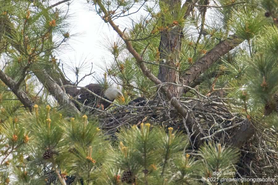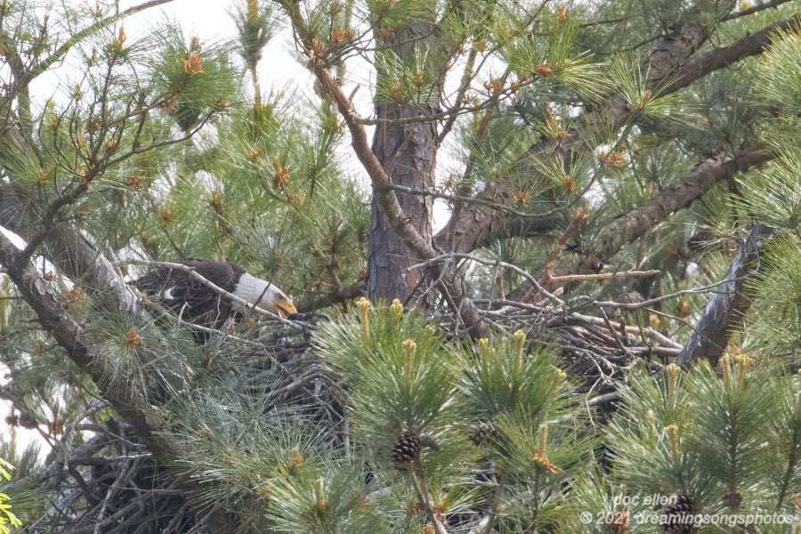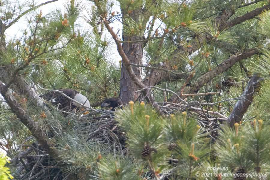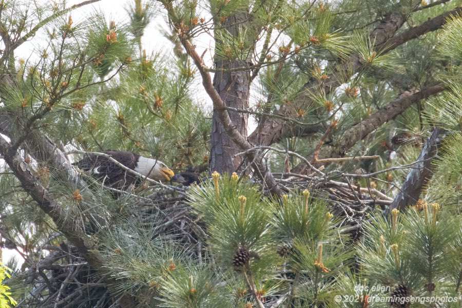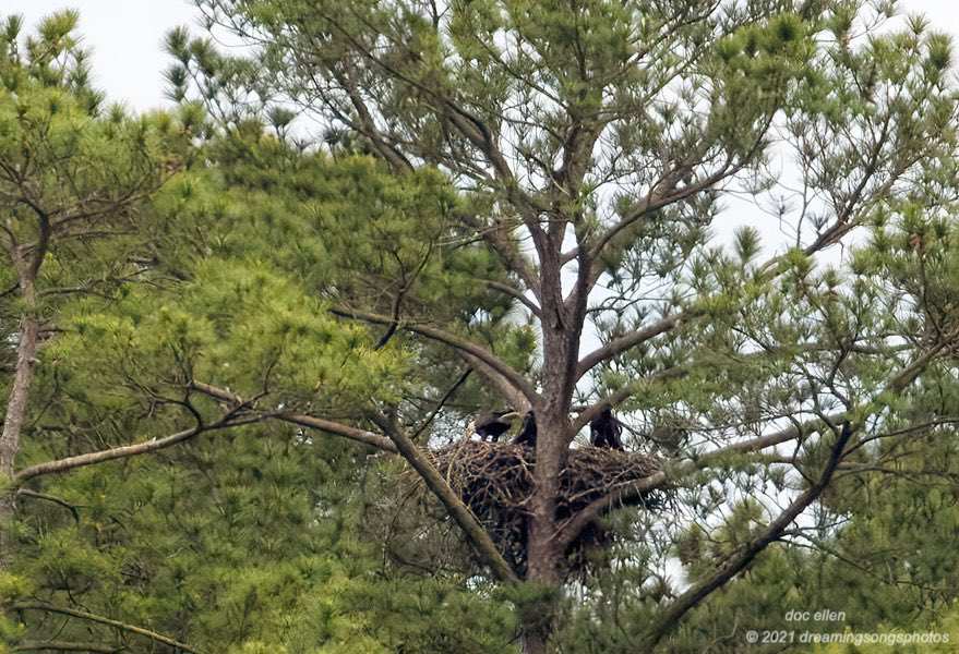 Looking left to right: Mom Godiva getting a piece of fish ready to feed to her rapidly growing chicks, a chick right against the main trunk of the tree and then the second chick to the right of the main trunk.