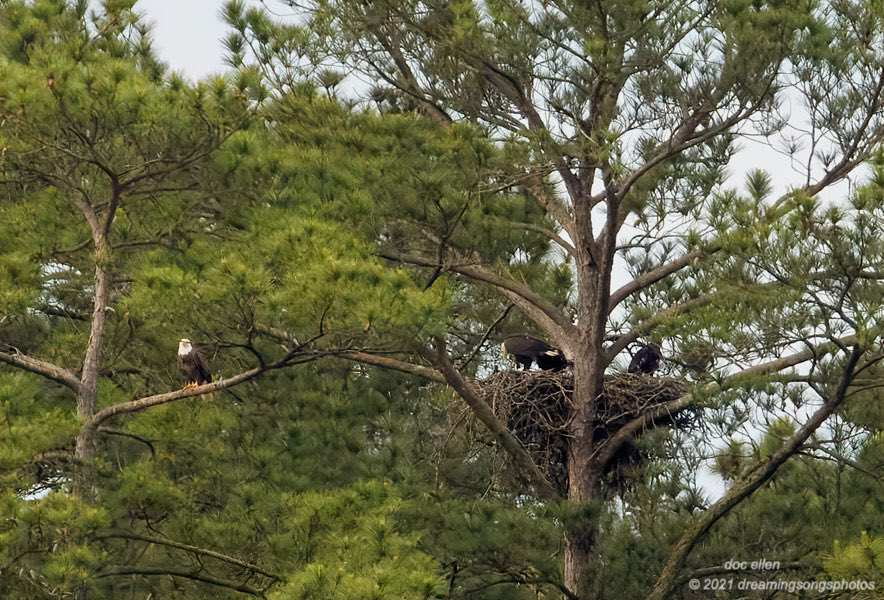 The whole family! That is Dad Hershey perched way to the left, then in the nest it is Mom Godiva, a chick trying to push in and get a bite of food and then the other chick still to the right of the trunk. Great getting to see the whole family all at once. And, it is easy to see in this photo how light brown Dad is … that is how he got his name … after the chocolate bar.