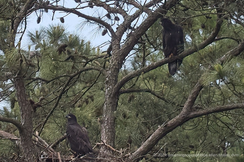 The two bald eagle chicks at First Nest have fledged! 1st fledgling in far upper right and empty nest far lower left. 2nd Mom Kate far left looking up to fledgling far upper right. Capt. Doug has been doing double duty: checking his nests as well as mine to monitor while I am in recovery. My recovery is being greatly helped by shared thoughts and photos from all of you and by Capt. Doug’s continuing observances at First Nest for me. Thank you all!