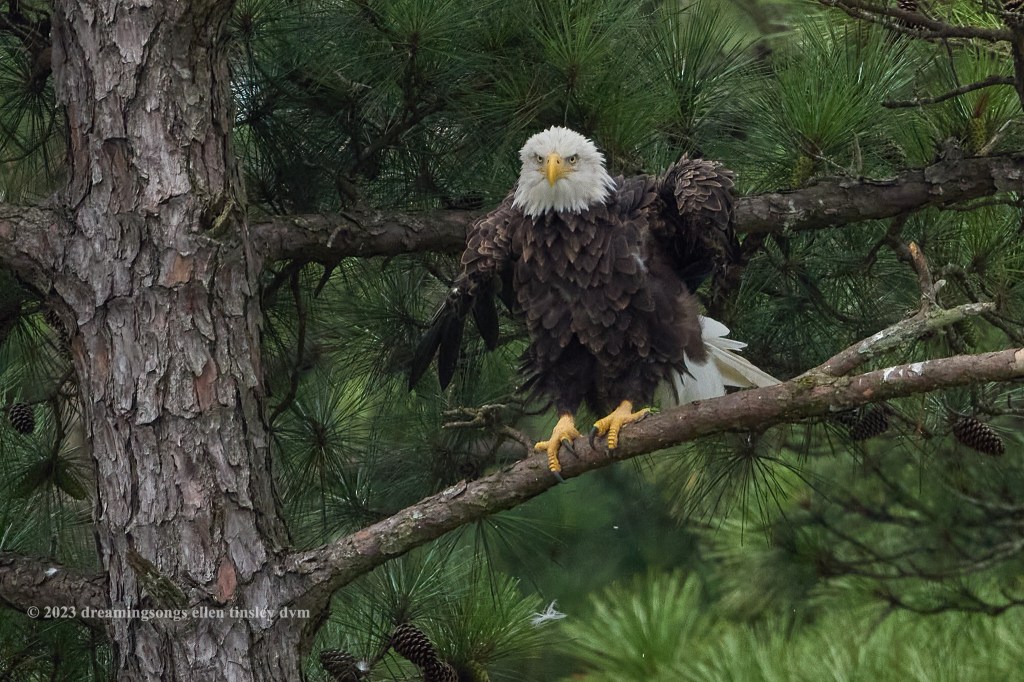 Jordan Lake. First Nest. The chick is certainly growing rapidly! The bald eagle is one of the fastest maturing birds known. It looks like this fellow is now about 8 to 9 weeks old. He is looking all about for his parents. The chick appears to be very well fed but when you’re a youngster … you know how it goes … you want food now!