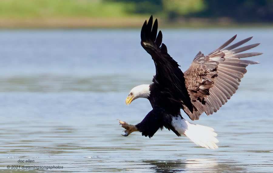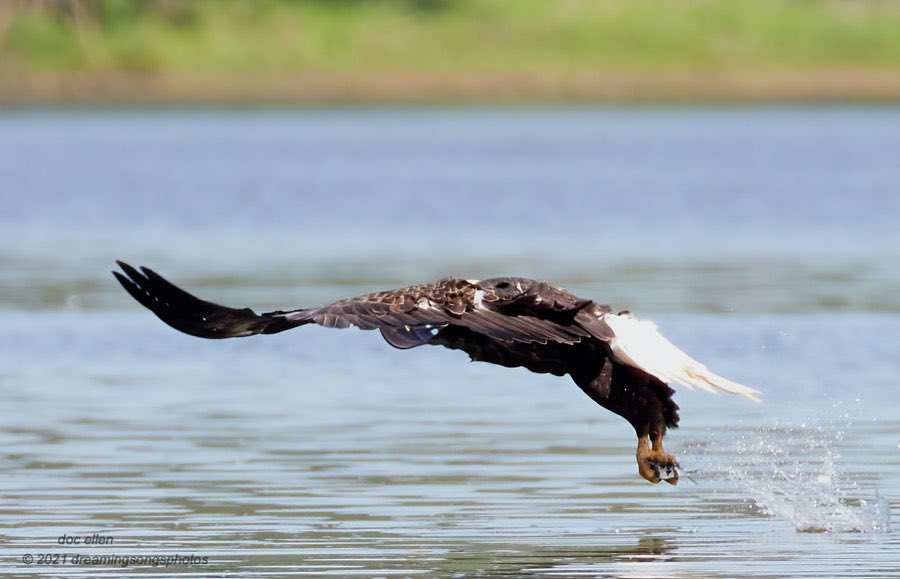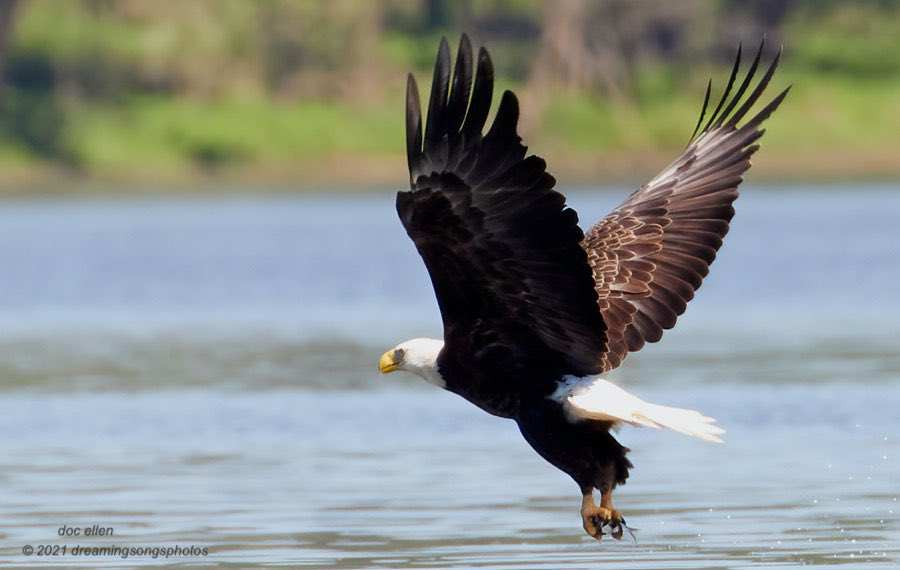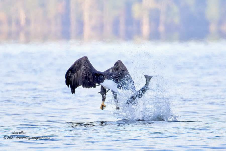 Jordan Lake. Bald Eagle Mom Godiva catches a fish with her feet then bends double and transfers the fish to her beak for the dash back to the safety of the trees on the shoreline.