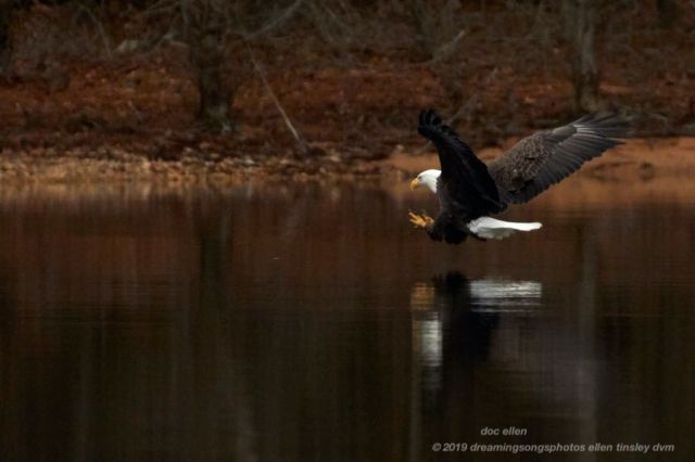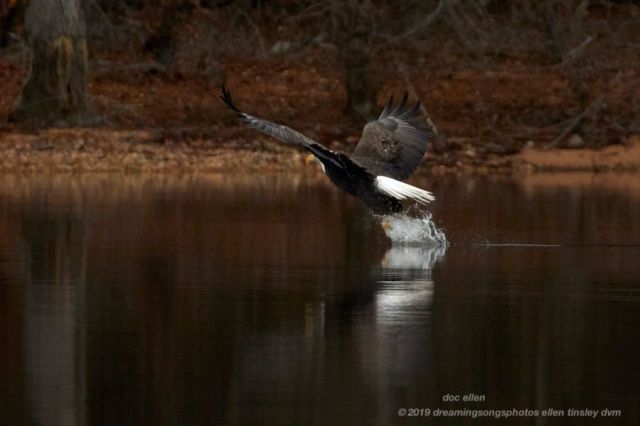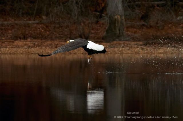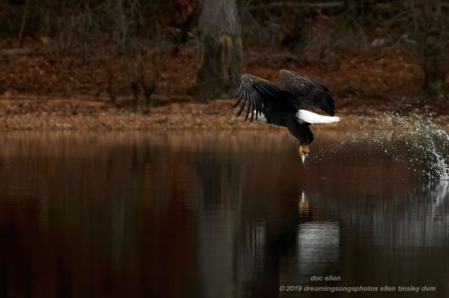 Fish are stunned by their passage through the Jordan Lake Dam. This makes it easier for the bald eagles to catch them. You can see the fish just before the bald eagle strikes!