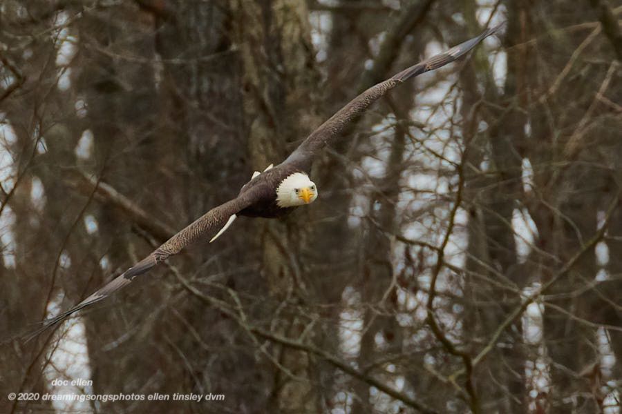 Mom Bald Eagle at Captain’s Nest went to gather a stick, in a mid-air pickup, for the nest repair needed before she lays her eggs. The stick did not cooperate at all!