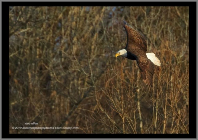 This 4-year-old bald eagle is using some of his feathers on the outer edges of his wing tips as ailerons to control his roll.