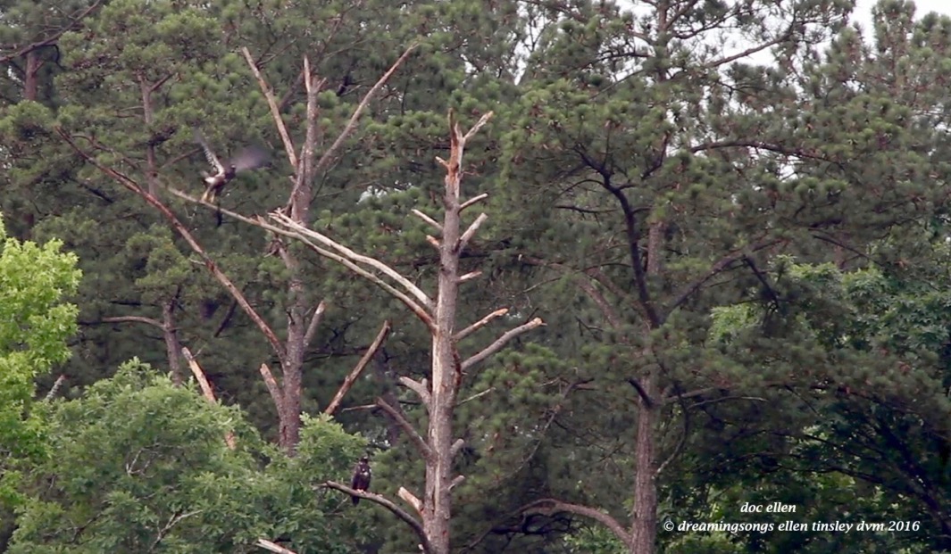 Big Chick as just taken off, while Little Chick watches from way down the tree.