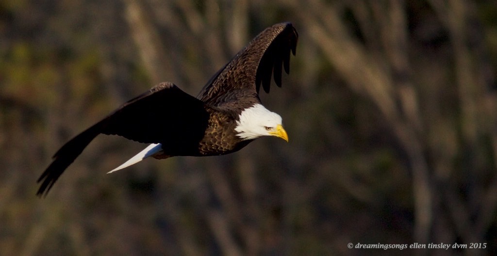 The eagle jumped Ace the osprey as the smaller bird lifted his fish from the river. For about 90 seconds the eagle pursued Ace, trying to get the osprey to drop his fish. An eagle will ram an osprey then catch the fish midair if the osprey drops it. Ace finally flipped up on one wing and dove between two closely growing trees, his fish still in his talons. The eagle sulked off down river.