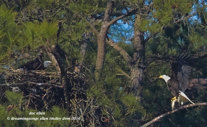 Jordan Lake: First Nest update. Bald eagles mate for life. Every breeding cycle they renew their commitment to each other by sky dancing and food offerings. Petruchio brings his mate Kate a bird as his commitment offering as they get very near to mating.