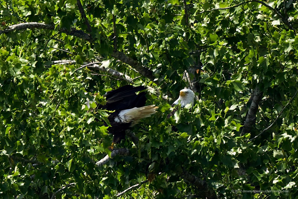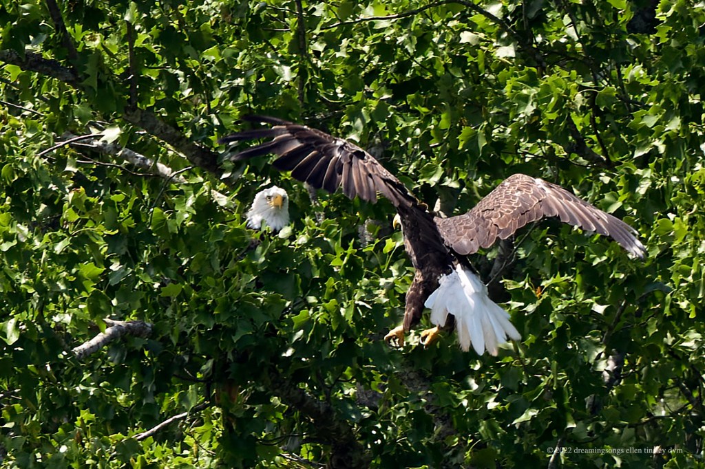 Jordan Lake. I was tracking a male bald eagle, who was heading for a landing. His mate was watching his projected flight path closely. She was trying to decide just where he was going to land. Her expression as he landed is just too funny.