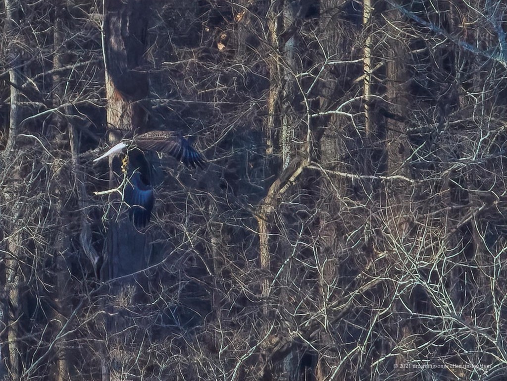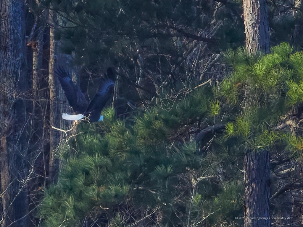 Jordan Lake, Bald Eagle First Nest: Mom Kate still has not yet laid her eggs. 1st photo Kate is in nest (see her tail to the left)and Petruchio is flying in. 2nd photo Kate has jumped up to branch above Petruchio (look for her yellow feet). 3rd photo Petruchio leaves and Kate watches him go. Tomorrow I will check again…