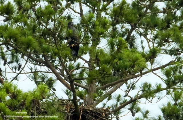 Bald eagles are not usually sociable. They tolerate a mate and their chicks. Sometimes in winter, bald eagles will congregate around a food source, but argue about it. Once a chick has fledged, the parents will provide it some food and protection into the fall, but then the fledgling is on its own. I have watched, once or twice a year, an eaglet (starting its first or second year of life) make a trip back to its home nest and be briefly tolerated by the parents. On March 26, 2020, I finally got to record one of these encounters. Kate and one of her chicks are visited by the 2019 male fledgling from First Nest. Eventually Petruchio took exception to the visitor and chased it away. I sure am glad I could show you this uncommon bald eagle event!