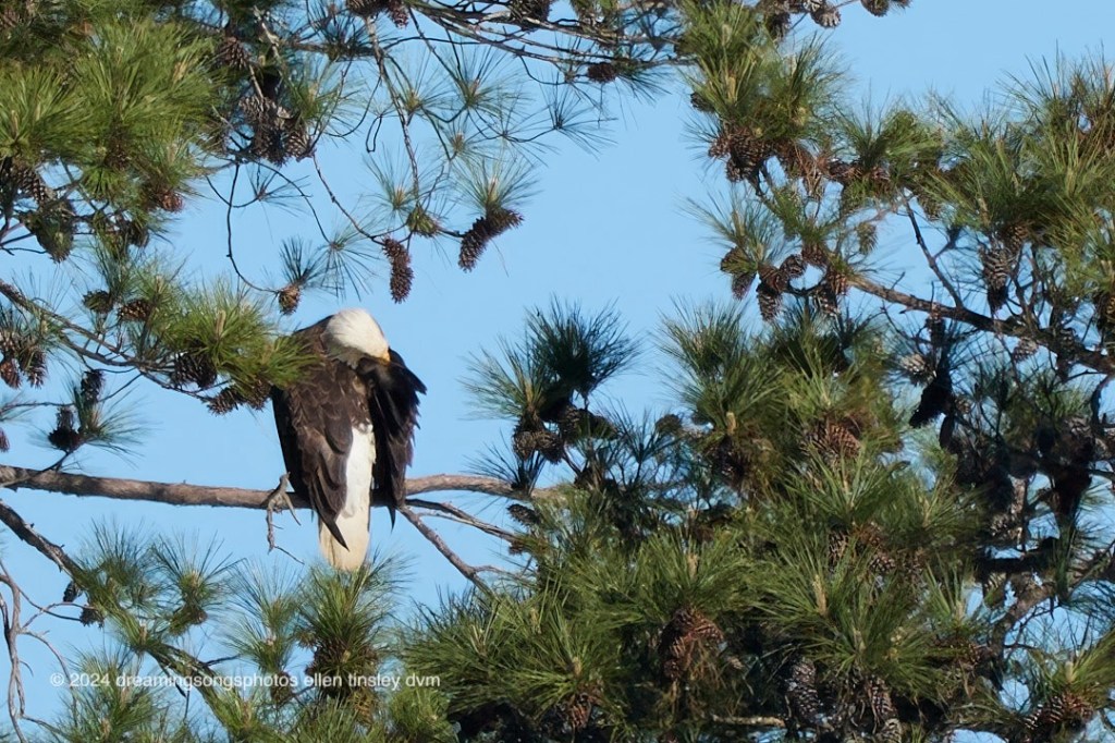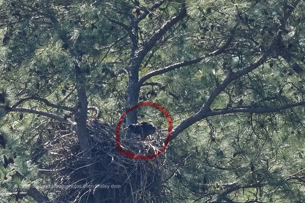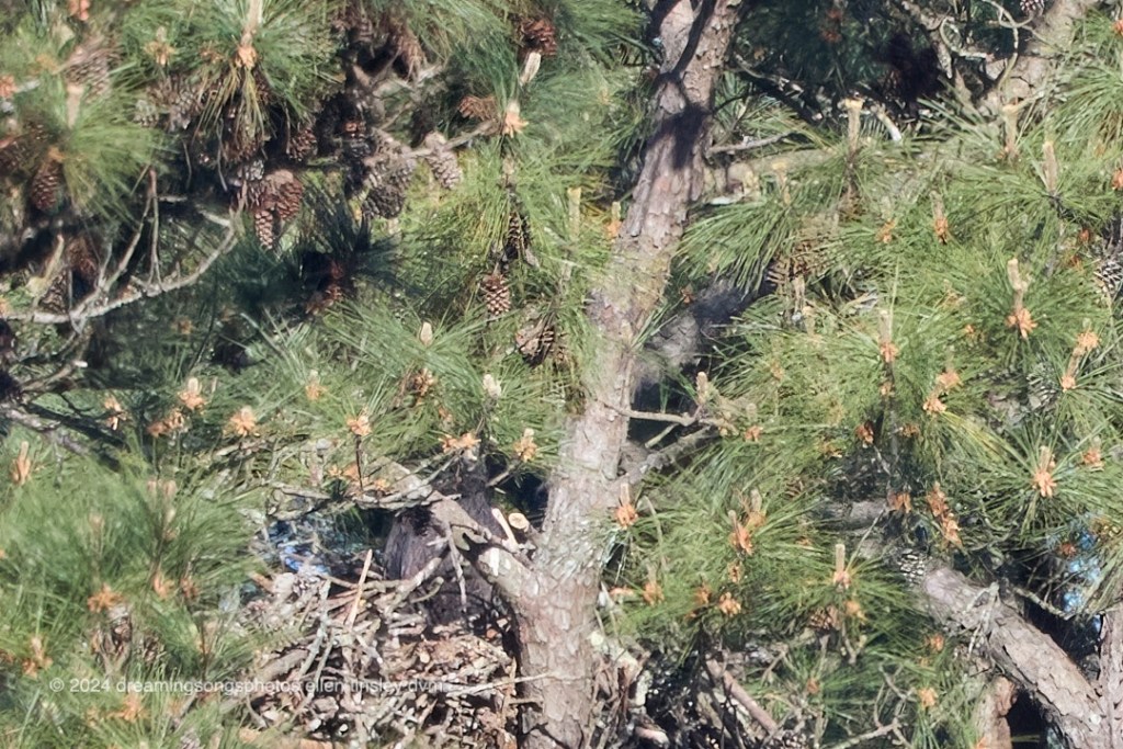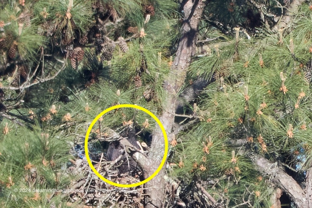 Jordan Lake. First Nest. This morning I managed to see the chick in the nest. It’s a little difficult to tell where the chick is so in the second photo I drew a circle around it. The chick is facing us. In the third photo you can see Dad Bart. He is preening hard! I did see Mom Kate but she went by so quick I didn’t get a photo of her.