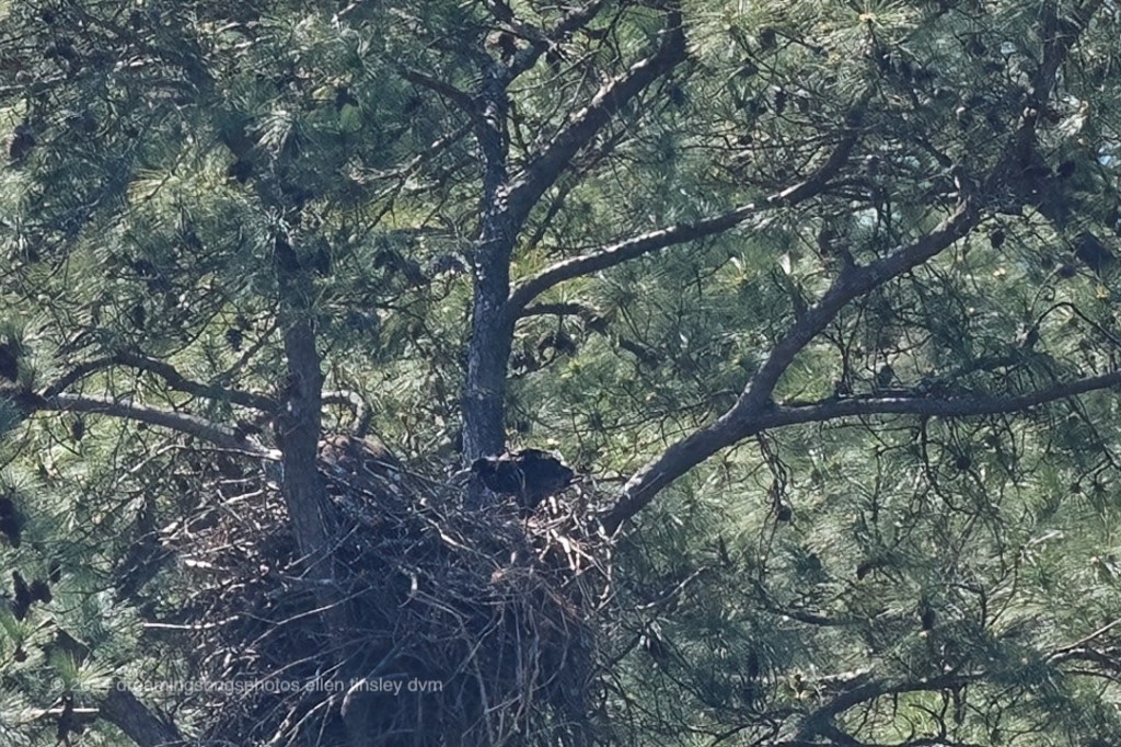 Jordan Lake. First Nest. Mom Kate had a big fish and she had a long way to travel to get it back to the nest. She was in a hurry! Then almost right behind her came Dad Bard with some fresh nest lining material. I don’t know how many chicks are in that nest but I can tell you this: they are well fed and pooping a lot so they have to be doing pretty darn good.