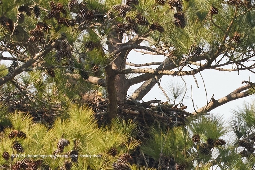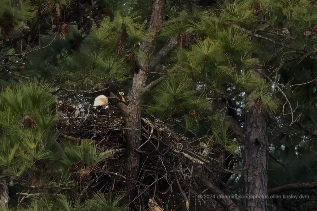 Jordan Lake. First Nest. My first glance up at the nest and I thought my goodness I’m seeing a very clear shot of Mom Kate brooding. Got my lens on the nest and realized that a spindly branch that had been obstructing my view of the nest was no longer there. I do not know if one of the parents removed that branch. Perhaps they accidentally knocked it out of the nest. Could’ve been the wind that took it out. I checked the rest of the nest and it looked just fine. So, I’m hoping this means that mayhap I will be able to get better photos of the nest and it’s occupants for us to share!
