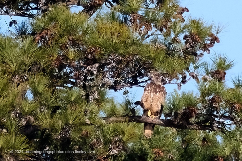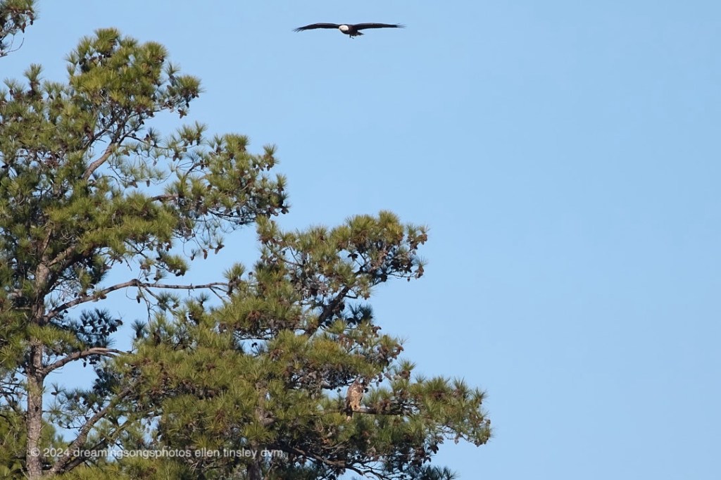 Jordan Lake. First Nest. Another of last year’s triplets visited its home nest! This time it was the biggest of the 3. Pine cones clustered near the young eagle’s head can make seeing the eagle a chore. In last photo Bard is flying right over the youngster after barely giving it a glance. Interesting!!!
