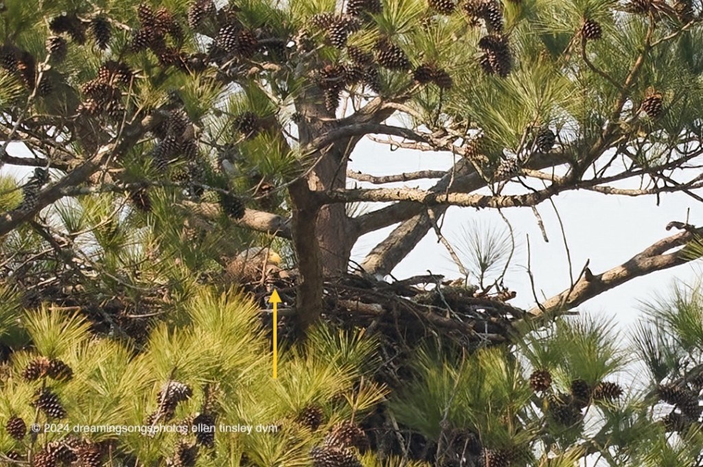 Jordan Lake. Captain Doug and I were out checking bald eagle nests. At Captain’s Nest we discovered Dad and his chick enjoying the warm and windy afternoon. The chick is immediately below Dad’s beak. Dad and chick are both looking to the right. Second photo has arrow pointing at chick’s eye.