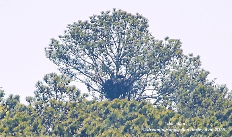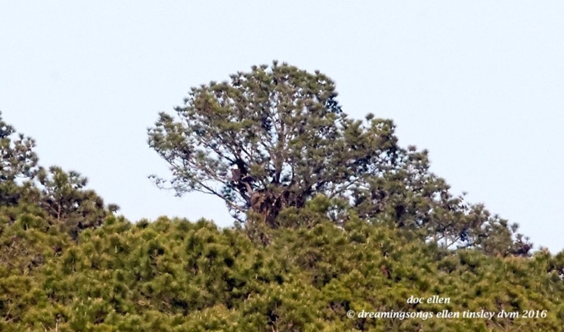 In this photo, the parent is on the “Sentinel” perch to the left and above the nest – again with its back to us so look for the white head and tail. The chick is almost centered in the nest. It looks like a black shadow shaped like the upper half of a long necked bottle. Wish I had a longer lens so we could all see more detail.