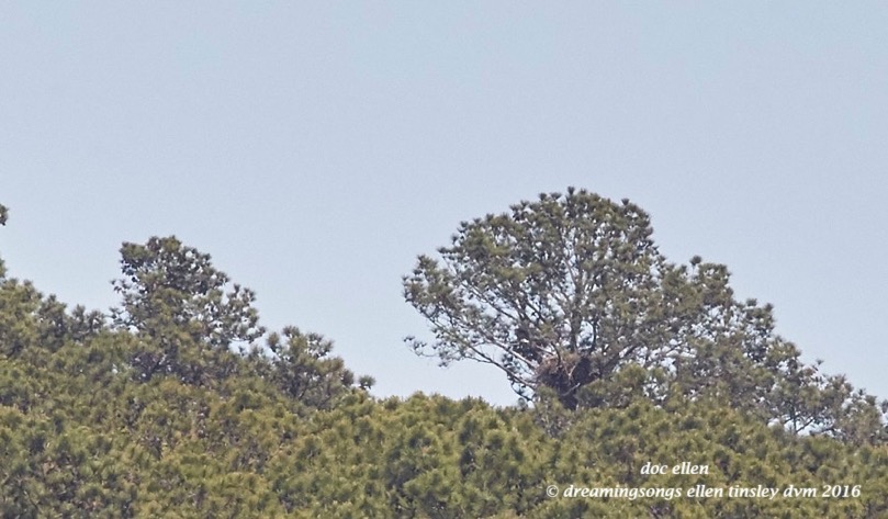 We watched the nest again this afternoon. There was still some wisps of smoke arising about the peninsula. We saw one parent at the nest for a while. It left. Watched 1 chick do some wing flaps. We saw a parent fly in to the nest but could not see if it was bringing in food and did not see feeding behavior. Have yet to see both parents together or both chicks at the same time. So, what we know is that at least one of the parents is flying about and returning to the nest and that there is one chick being active – both observations make me happy. What will make me happier is to see both chicks at the same time. The photo was taken this afternoon about 3:45 PM. If you look closely above the nest and to the left, you can see an adult eagle – it has its back to you so its tail is the easiest way to identify it. No chicks in this photo.
