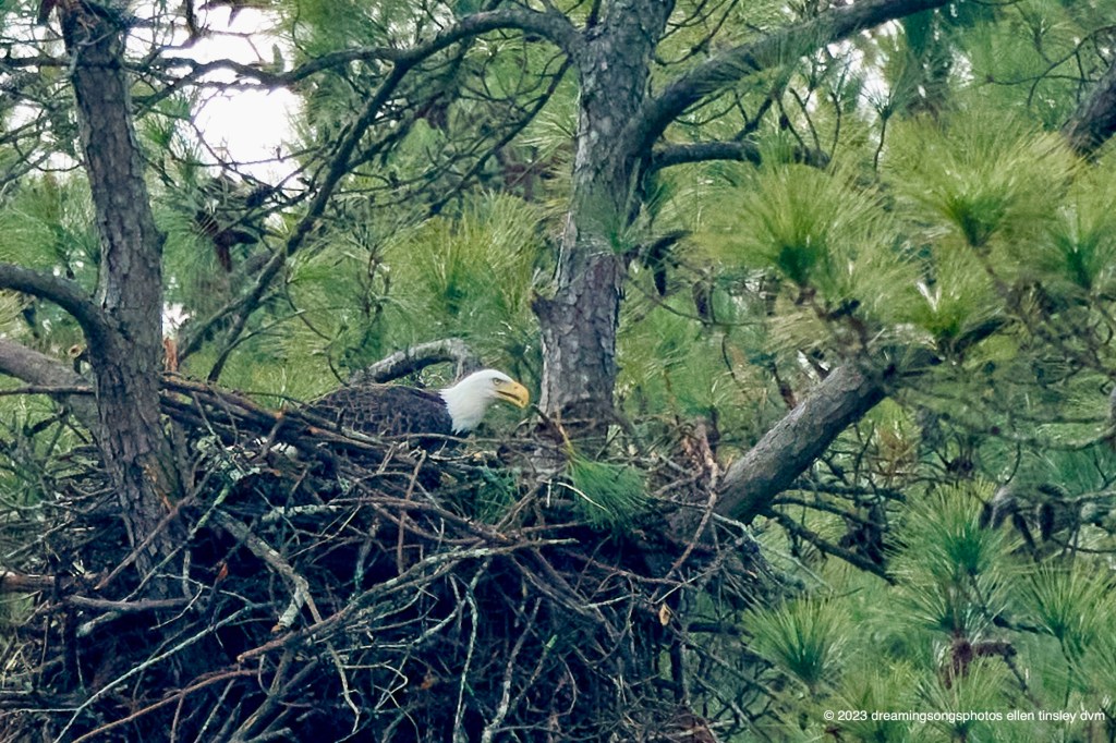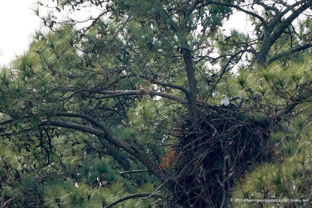 First Nest. As of Thursday afternoon mom Kate had not yet laid eggs. Captain Doug and I were out checking on the nests. We found Bard at First Nest being quite put out. He looked left, he looked right, he looked high and was wondering where the heck was mom Kate. Most likely she was out fishing for her own supper. I’ll be back out the next day or two and hoping to find one or the other of the parents in incubation. #FirstNest #DocEllensJourney