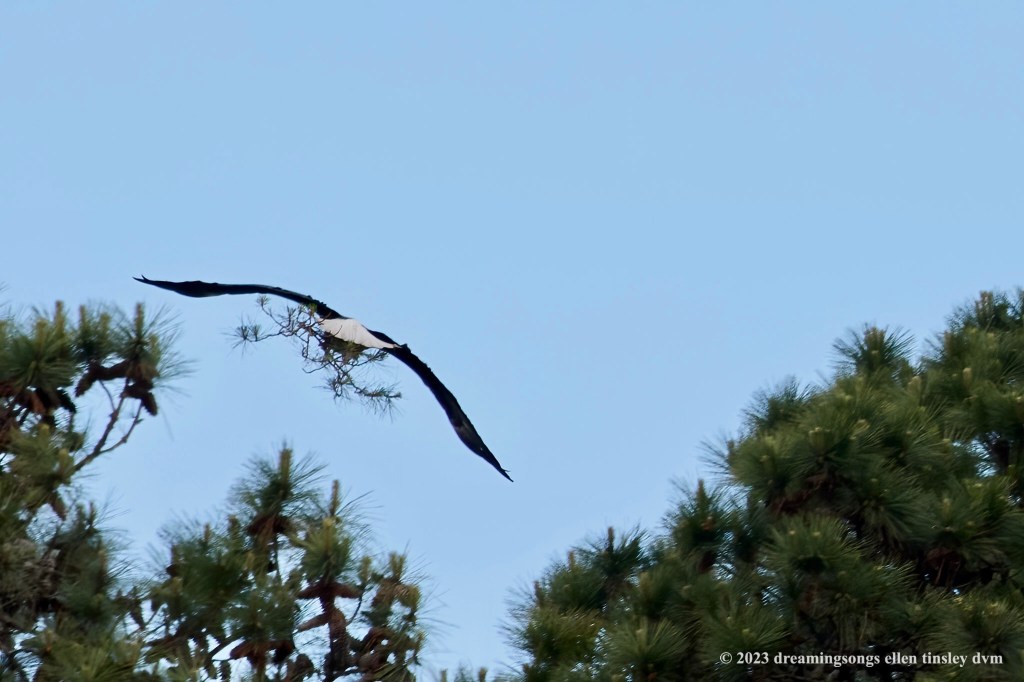 Jordan Lake. First Nest. With 3 rapidly growing chicks bouncing around in the nest, the parents have to bring in sticks and repair the nest. Dad Bard went dashing out and grabbed the top of a small pine tree and headed back to the nest. That’s him piling into the nest from the left-hand side while mom Kate is on the right hand side with fish to feed the chicks. Crowded!