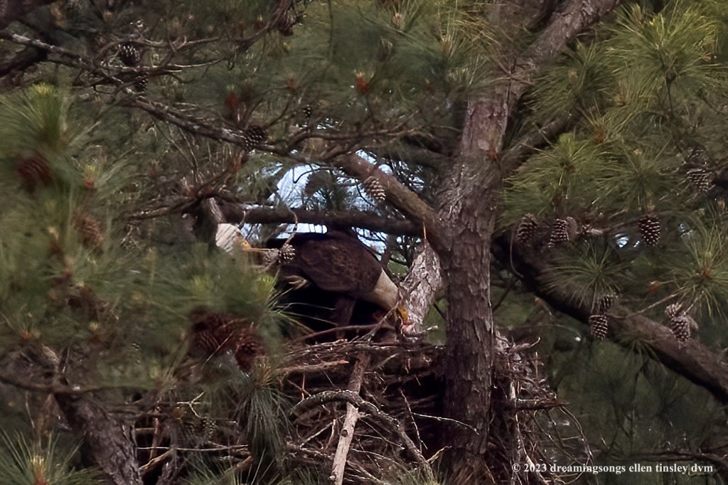 Jordan Lake. First Nest. The lake level is at 219.75 ft which is 3.75 ft above normal. I am still not able to see First Nest. However, I did watch Mom Kate take a fish in past the tree line – headed for the nest. Dad Bard came by on a thermal. Every day I hope the lake is down enough so I can get in and see the chicks. I bet all of you are hoping that too!