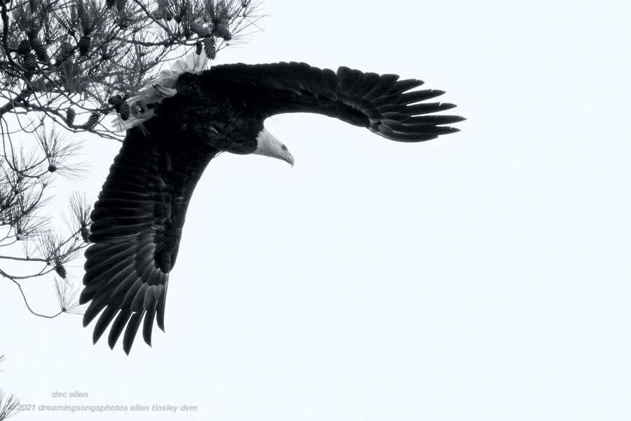 Jordan Lake, Haw River: Doc Ellen’s Palette, where the 12-year-old child in me looks at the world a wee bit differently. Bald Eagle Fledgling in Black and White. And, oh so well camouflaged – look for the very black beak!