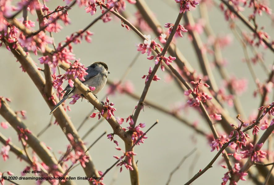 I was trying to choose my photos for tonight’s posting and stopped searching when I got to this Carolina chickadee from this morning. I paused and looked at the softness of the almost spring in the pinks of the redbud tree blossoms and the elegant contrast of the small bird’s black and white plumage. Thought: we could all do with a quiet moment in these days of stress. So, take a minute and just be, just be with the little chickadee as he too paused in his day. Peace and Grace, Doc Ellen
