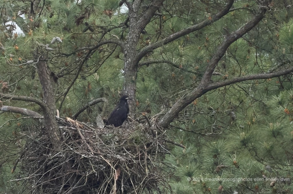Jordan Lake. First Nest. The chick is certainly growing rapidly! The bald eagle is one of the fastest maturing birds known. It looks like this fellow is now about 8 to 9 weeks old. He is looking all about for his parents. The chick appears to be very well fed but when you’re a youngster … you know how it goes … you want food now!